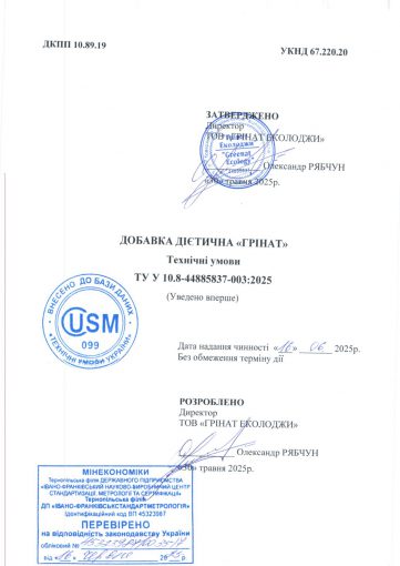 Добавка дієтична “Грінат” – використовується у вигляді рідких добавок (іонна форма), що містять понад 52 іонні мікроелементи. Зазвичай рекомендується приймати 0.2 мл на 1 кг маси тіла на день (20 мл на 100 кг маси тіла), додаючи у воду або сік.